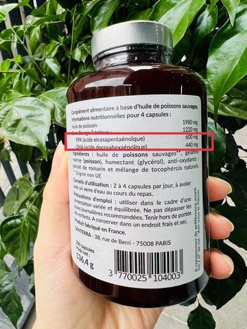 - Dầu cá hoang dã tinh khiết: 1980 mg/4 viên nang, trong đó Omega 3 tổng cộng là 1220 mg (EPA 600mg; DHA 440mg).